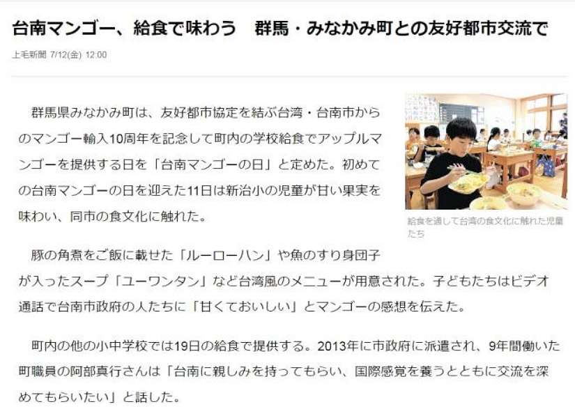 台南是台灣最重要的芒果產區,市長黃偉哲為了推廣台南芒果的好滋味,近年致力將台南芒果外銷至日本等海外市場,並透過實質的城市外交,將台南芒果介紹給國際友誼市。其中日本群馬縣水上町為紀念進口台南芒果10周年,今年特別將學生營養午餐享用台南愛文芒果的日子定為「台南芒果日」。