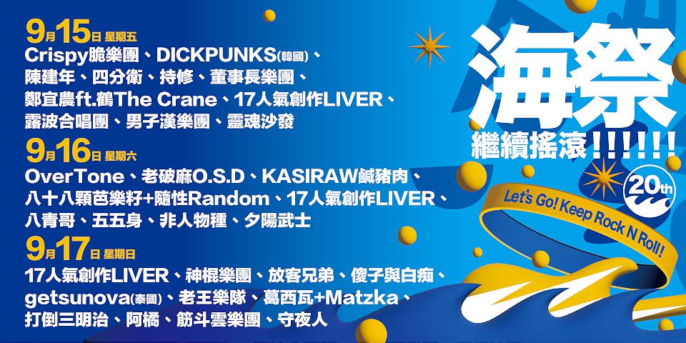 新北市貢寮國際海洋音樂祭為新北市指標性的音樂活動,今年邁入第20屆,特別邀請歷屆海洋獨立音樂大賞得獎樂團再次站上大舞臺,與全場民眾一起搭上時光機,重溫20年貢寮國際海洋音樂祭的經典演出,總計超過30組歌手、樂團將於9月15日(五)至17日(日)連續三天在貢寮福隆海水浴場輪番登場,其中包括第34屆金曲獎多組入圍及獲獎樂團參與。