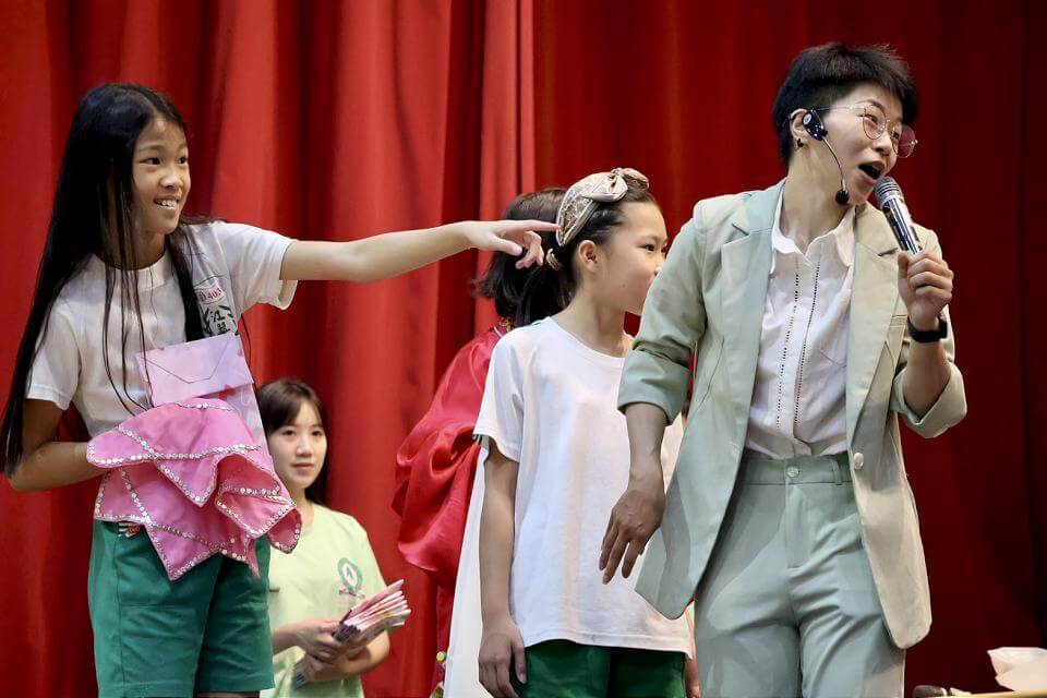 民權歌劇團與國小學童趣味互動推廣歌仔戲。翻攝新北市政府