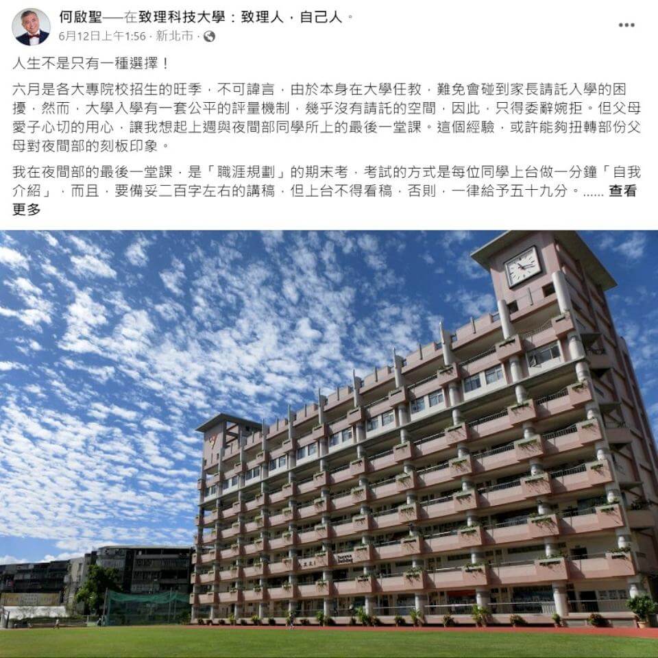 從新聞主播到職場專家,這兩年又轉戰至大學任教的何啟聖,在臉書上提到不少親友請託,希望將孩子送進致理,但大學入學有一套公平的評量機制,根本沒有請託的空間,不過卻讓他想起在夜間部的最後一堂課,是「職涯規劃」的期末考,考試的方式是每位同學上台做一分鐘「自我介紹」,而且,要備妥二百字左右的講稿,但上台不得看稿,否則,一律給予五十九分。