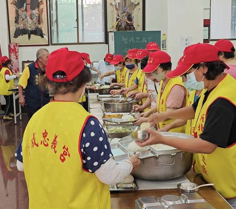 位於三芝區的智成忠義宮,信仰為儒宗神教,信仰主祀神明為關聖帝君(五聖恩主),近期首創「老人共茶」創意,將被丟棄的紅豆餅烤盤打造成泡茶聊天必備的茶盤,並融入八卦易經元素,讓社區長者們能夠圍著八卦茶盤聊天,透過日常的泡茶聚會彼此交流、分享生活,感受其中的趣味,這不僅是飲食的分享,更是心靈的連結。