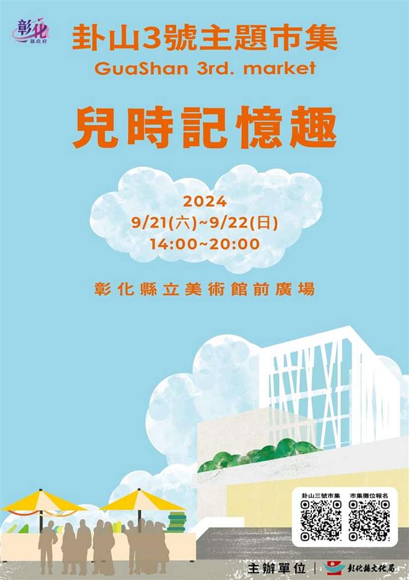 一起回憶美好兒時記憶!大家期待已久的卦山文創市集「兒時記憶趣」將於9月21日至22日下午2點,於彰化縣立美術館前廣場登場,另外,在美術館內自即日起至113年10月6日展出「千里快哉風~許文融創作展」,展至113年10月6日,此次藝術特展以科技結合藝術,不僅以新創作、結合AR觀賞模式的科技藝術,還有巨幅水墨長卷《臺灣風物圖卷》繪動起來,精彩可期,展至11 月 3 日,彰化縣長王惠美歡迎大家來遊市集,賞會動的藝術之美。