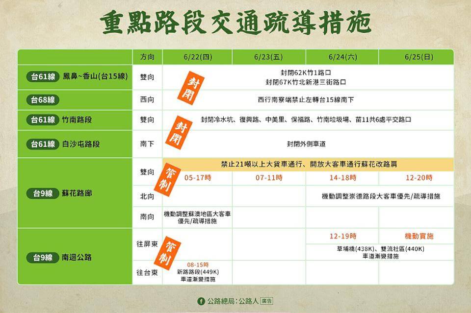 另外還有重要觀光風景區,台2線福隆及萬里至大武崙路段、台2線及台2乙線關渡至淡水路段、台3線及台7線大溪至慈湖路段、台9甲線新店至烏來路段、台9線礁溪路段、台14甲線清境農場路段、台21線日月潭周邊路段、台3線古坑至梅山路段、台26線墾丁路段等,請民眾會行經這些路段時,能多點耐心聽從交通人員指揮疏導。(記者黃子瑋/台北報導)