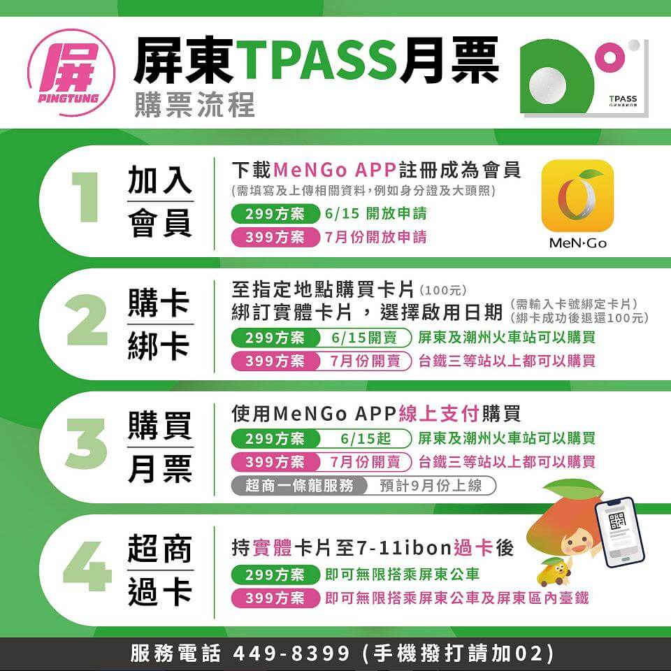 首次購買月票須至MeNGo網站或APP申辦會員,再前往購買月票實體卡,每張卡預付100元。購買票卡後須前往會員綁定卡片,首次購買乘車前,須完成記名手續,可獲得購卡費用100元的回饋。完成購卡、實名登記、並購買「屏東公車暢行299元月票」方案後,即可在選購後30天內無限搭乘上述指定運具。