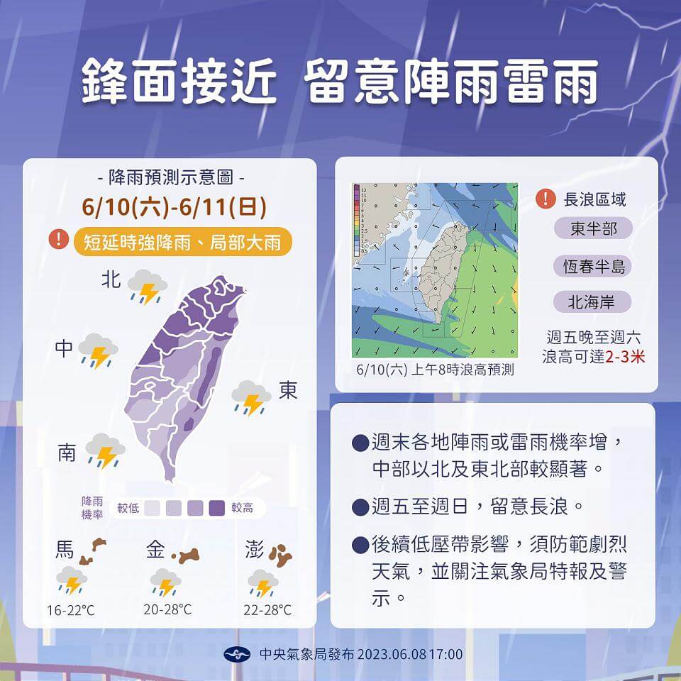 週六(10日)、週日(11日)鋒面南移至北部海面,降雨熱區擴展至中部以北、東北部,南台灣也開始不限午後,有局部短暫陣雨、雷雨,各地易有短延時強降雨,並有局部大雨發生的機率;另外受谷超颱風往北移動影響,基隆北海岸、東半部及恆春半島有長浪發生的機率,沿海浪高約2至3米左右,前往海邊活動請特別留意。