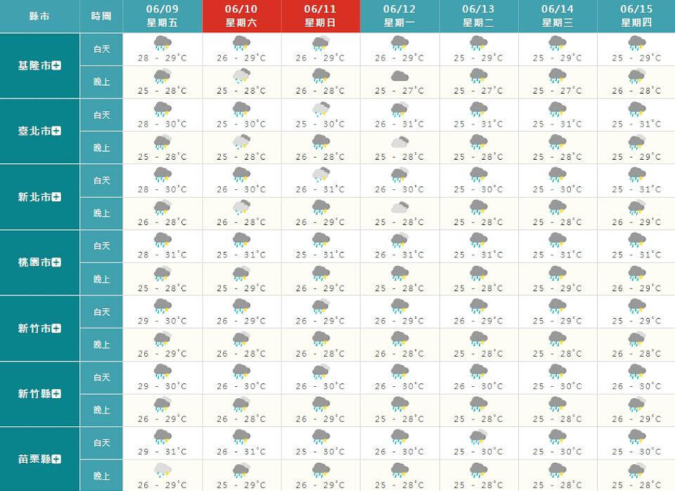 週五(9日)鋒面接近及偏南風影響,北台灣開始出現不限午後發生的局部短暫陣雨、雷雨,北部及東北部地區有局部短暫陣雨或雷雨,其他地區有零星短暫陣雨。