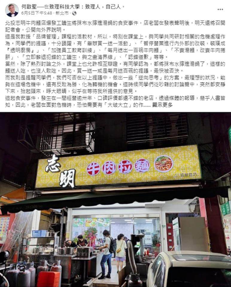 台北市北投志明牛肉麵店爆發工讀生將抹布水擰進湯鍋的食安事件,店老闆在發表聲明後,6日臨時取消招開記者會,僅以書面發表道歉聲明,致理科技大學行銷與流通管理系專任教授的TVBS前新聞主播何啟聖,5日在臉書將他所教授的「品牌管理」課堂上,就結合熱門的時事議題,與同學們研討如何化危機為轉機,提出三招讓讓老牌的志明牛肉麵店轉危為安。