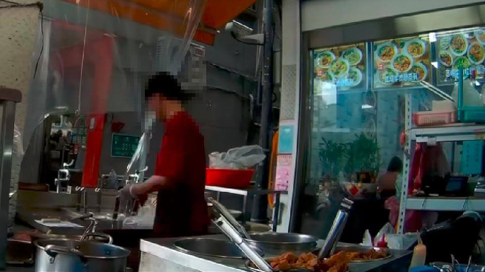 志明牛肉麵員工將將擦拭鍋邊溢出水的抹布,直接將水擰進鍋內。翻攝爆料公社