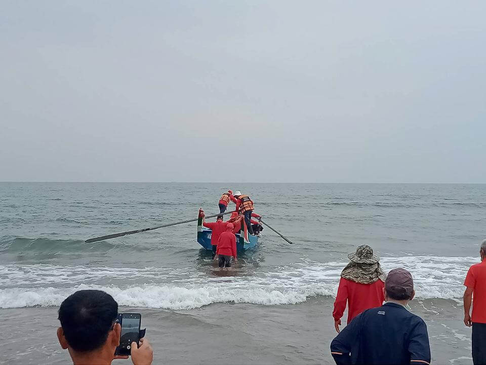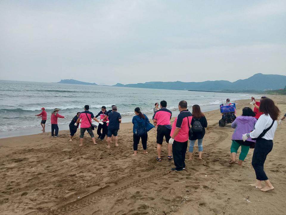 眾人合力在海浪拍擊下將漁獲拉上岸。翻攝新北市政府