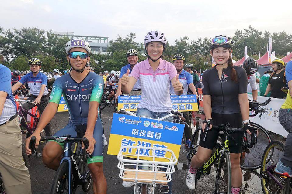 縣長許淑華、自由車國手盧紹軒、單車女神魏華萱帶頭領騎。翻攝南投縣政府