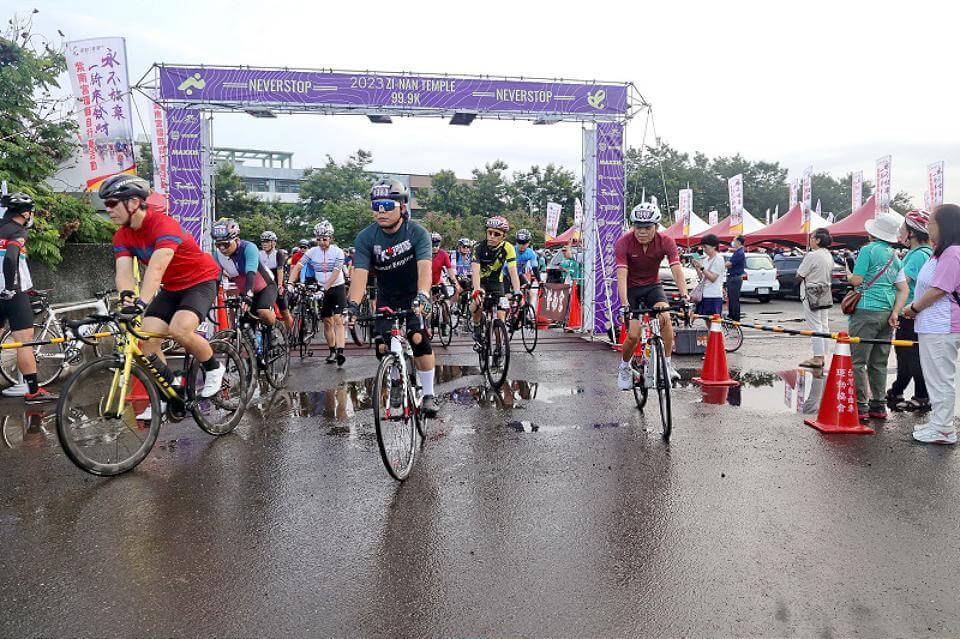 第11屆「2023永不放棄一騎來發財-紫南宮環縣極限挑戰99.9K」自行車活動,4日上午6時3024位國內外選手整裝待發,縣長許淑華、自由車國手盧紹軒、單車女神魏華萱帶頭領騎,拉開挑戰序幕。