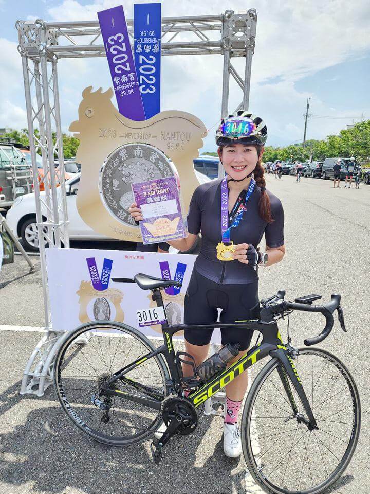 單車女神魏華萱完賽,拿到超吸睛金雞獎牌。翻攝南投縣政府