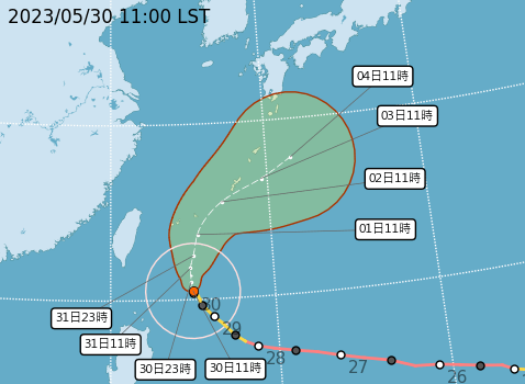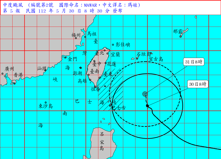 中度颱風瑪娃(國際命名MAWAR)30日8時的中心位置在北緯20.4度,東經125.0度,即在鵝鑾鼻的東南東方約460公里之海面上,以每小時4轉6公里速度,中心最大風速為每秒 43 公尺,向北北西進行。其所處及未來行經路徑上之海溫條件不利發展,強度有持平或減弱的趨勢,平均七級風暴風半徑約 300 公里,颱風東南側水氣較多,對流發展亦較旺盛。