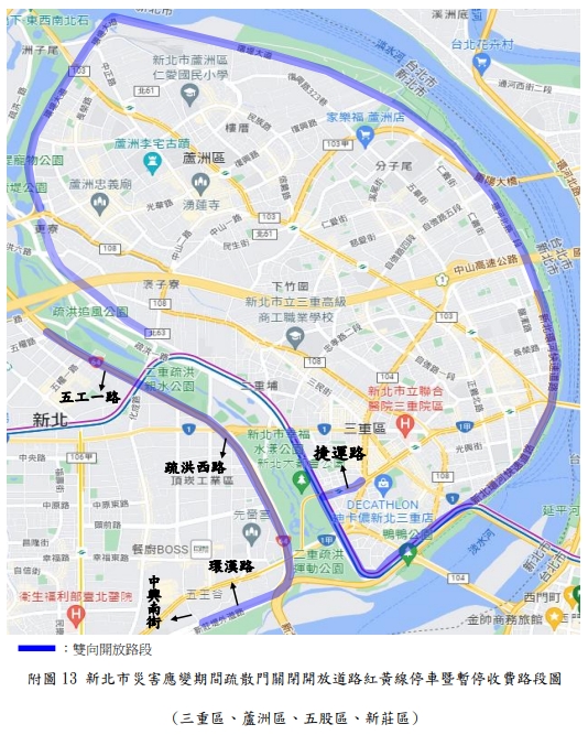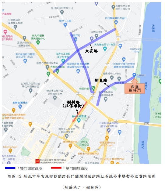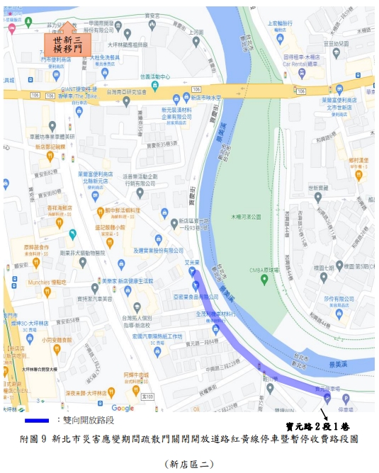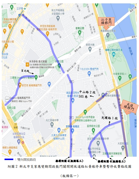 新北市政府表示,新店溪、大漢溪、淡水河流域內之橫移門及二重疏洪道各越堤道路、新莊西盛至三重重新橋堤外便道、樹林柑園至鶯歌堤外便道及板橋大漢橋至城林橋堤外機車道,將在2日上午10時完成關閉,水門周邊部分紅黃線開放停車。(記者黃子瑋/新北報導)