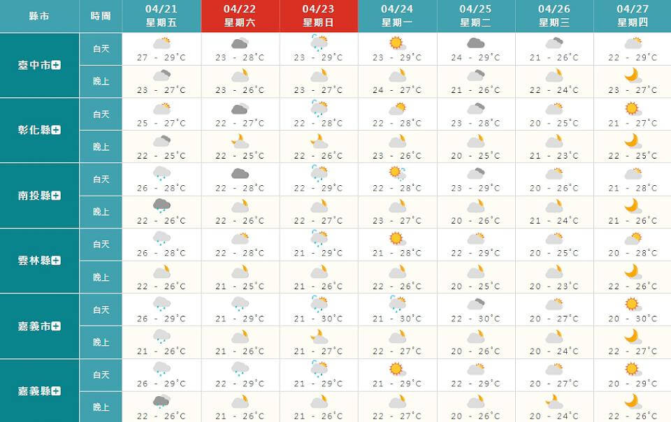 週五(21日)鋒面通過,中南部、東部及東南部地區有短暫陣雨,其他地區亦有局部短暫陣雨。北台灣溫度偏涼,高溫在22度到25度左右,其他地區溫度在26度到28度左右。