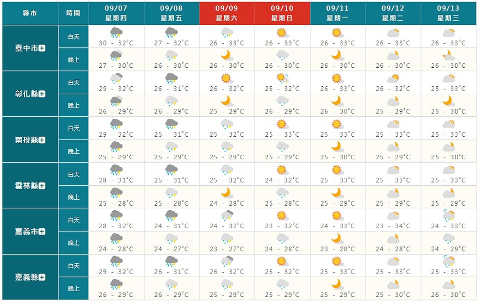 週六(9日)、下週日(10日)為水氣逐漸減少的過程,週六東部、東南部及南部地區有局部短暫陣雨或雷雨,環境轉為東北風,基隆北海岸及東北部地區亦有零星短暫陣雨,其他地區為多雲到晴,午後有局部短暫雷陣雨,南部地區有局部較大雨勢發生的機率;下週日南部及東南部地區有局部短暫陣雨,基隆北海岸、東北部及東部地區亦有零星短暫陣雨,其他地區為多雲到晴,午後中部地區及北部山區有局部短暫雷陣雨。