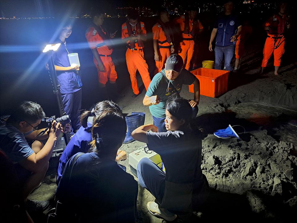 為紓緩海豚緊張情緒,現場救援不斷在鯨豚身上澆水,獸醫施打鎮定劑後,救援人員奮力將鯨豚搬上沙灘車上,在沙灘車的運送接駁縮短救援時間,在短短3個小時順利送上卡車載往八斗子安置。