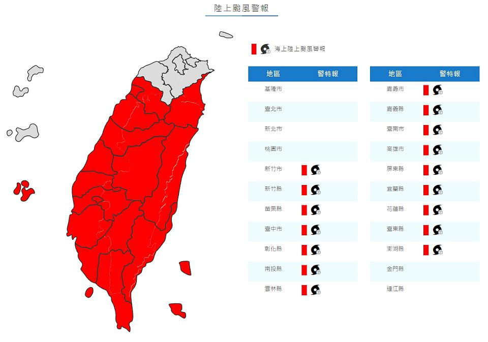 中央氣象署表示,目前發布陸上颱風警戒區域有宜蘭、花蓮、臺東、南投、新竹、苗栗、臺中、彰化、雲林、嘉義、臺南、高雄、屏東、恆春半島,海上警戒區域有台灣東半部海面、台灣海峽、巴士海峽及東沙島海面航行及作業船隻應嚴加戒備。