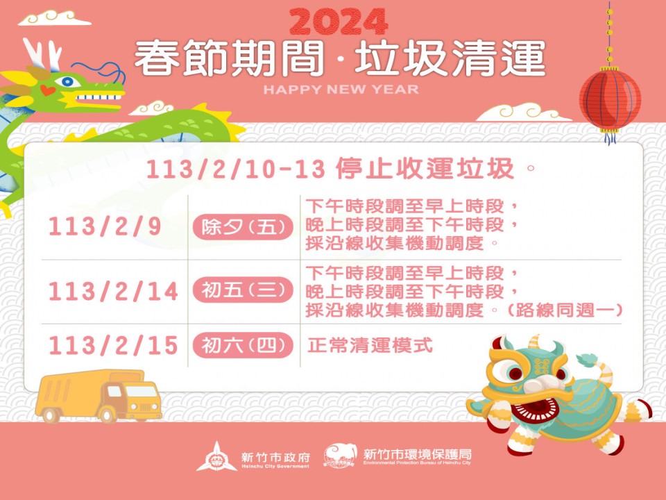 2月9日(週五、除夕):因應農曆年前大掃除垃圾量增加,垃圾清運時間將下午時段調整至上午時段,晚上時段調整至下午時段,採沿線收集、機動調度方式。