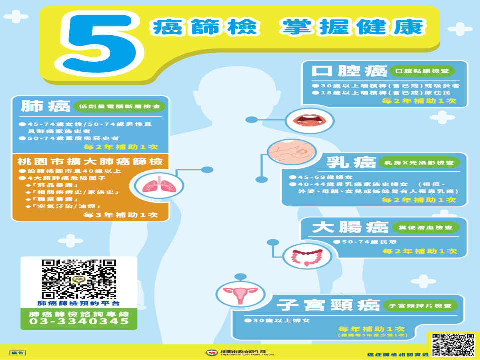 癌症已連續41年蟬聯國人十大死因之首,2月4日是世界癌症日,桃園市衛生局統計112年結合575家醫療院所,提供口腔癌、大腸癌、子宮頸癌、乳癌及肺癌等5項癌症篩檢,共46萬1899人次,找出確診口腔癌59人、大腸癌220人、子宮頸癌299人、乳癌408人及肺癌147人,衛生局呼籲善用5項免費癌症篩檢及桃園市擴大肺癌篩檢,鼓勵符合資格者踴躍接受檢查,以早期發現早期治療。