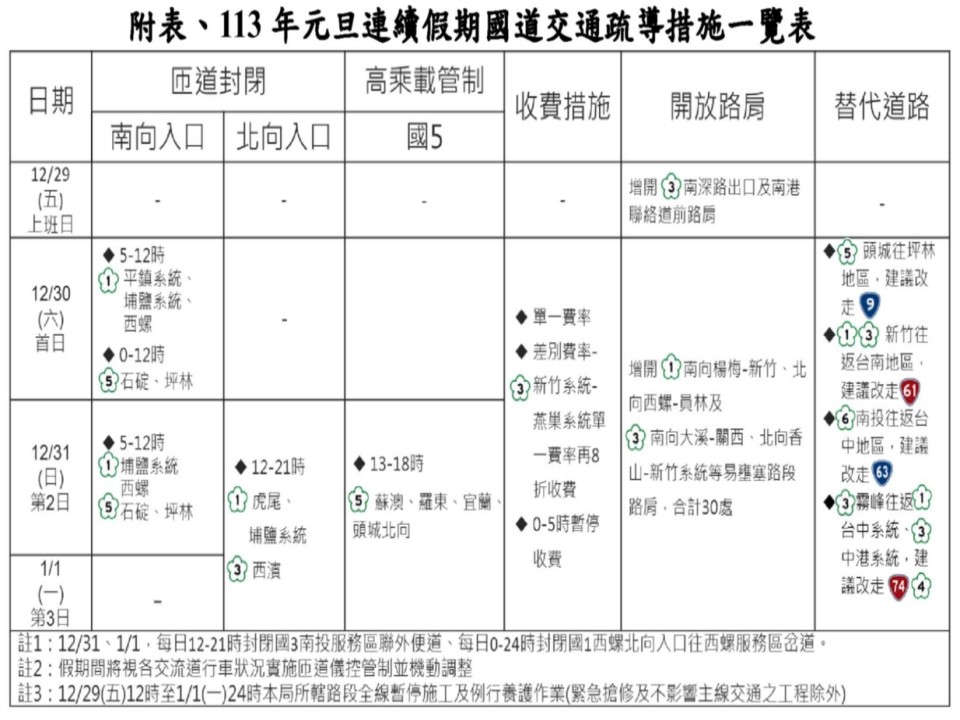 元旦連假即將到來,高速公路局預估113年元旦連假及假期前一日,預估3天假期交通量為106~116 mvk(百萬車公里),首日南向可達64mvk為平日的1.5倍,尤其是國5將湧現往花東旅遊車流,造成尖峰時段往國5車流有排隊回堵狀況,建議民眾多利用公共運輸或改走替代道路避壅塞,同時為鼓勵民眾搭乘公共運輸。