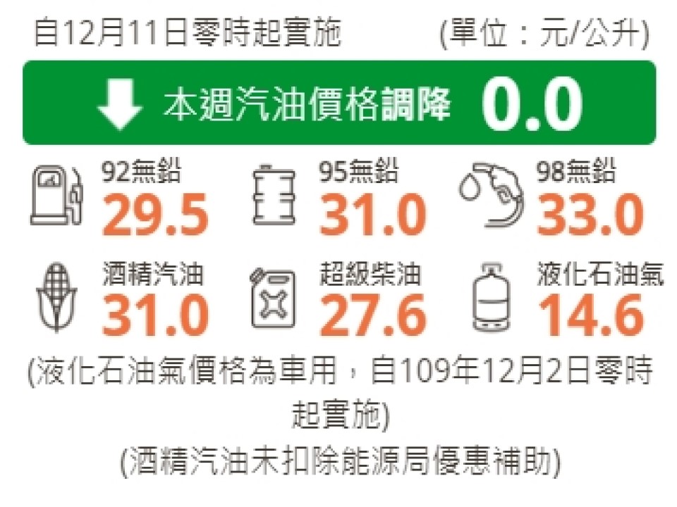台灣中油公司明天(11日)凌晨零時起汽油價格不調整、柴油價格調漲0.6元,參考零售價格分別為92無鉛汽油每公升29.5元、95無鉛汽油每公升31.0元、98無鉛汽油每公升33.0元、超級柴油每公升27.6元。本週因雙重平穩機制啟動,汽、柴油各吸收0.3元及0.9元。