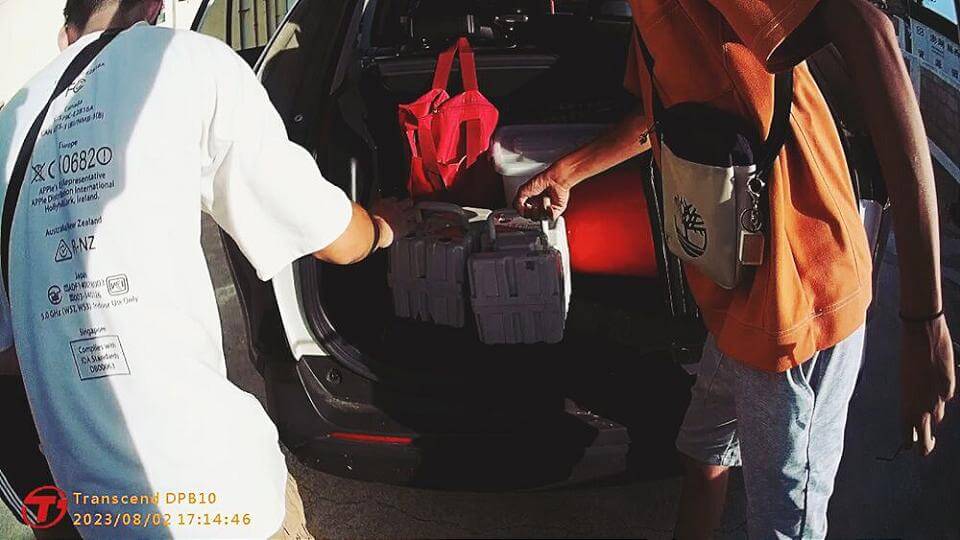 他們揮汗如雨來到白沙警分局西嶼分駐所,希望能充電後繼續行程,但因為充電速度緩慢,員警暖心避免他們留下遺憾,就載他們到最近的外垵超商換電池,再回到分駐所繼續行程。(記者余珩維/澎湖報導)