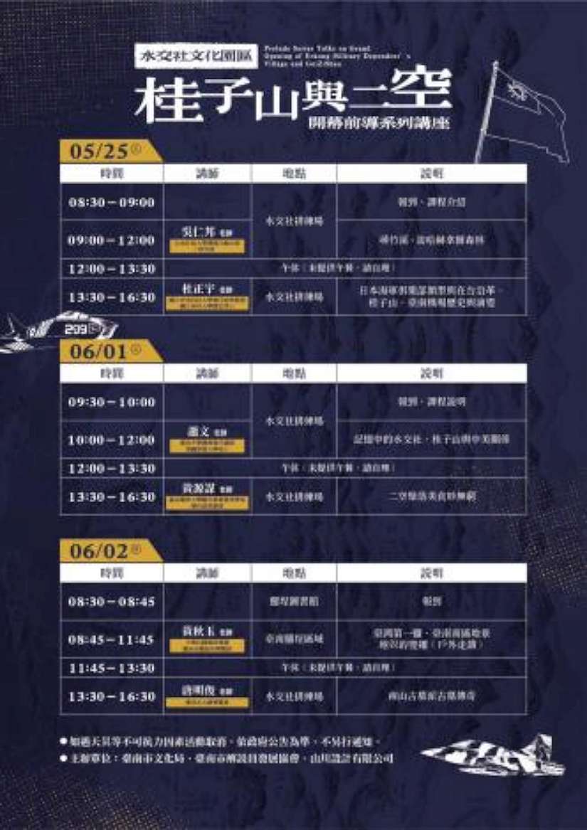 〈桂子山與二空開幕前導系列講座〉,特邀不同主題專業師資,分別在5月25日、6月1日與6月2日舉辦走讀課程。5月25日由臺南社區大學吳仁邦探尋「尋竹溪˙訪哈赫拿爾森林」、屏東大學杜正宇老師分享「日本海軍俱樂部類型與在台沿革」;6月1日聚焦眷村主題,由水交社原眷戶蕭文老師分享「記憶中的水交社、桂子山和中美關係」、嘉南藥理大學黃源謀老師分享「二空聚落美食妙無窮」;6月2日課程則帶大家走訪桂子山與二空新村周邊區域環境,分別由黃秋玉老師與唐明俊老師,帶領學員走讀鹽埕觀察地貌變遷,並分享南山古墓歷史故事。