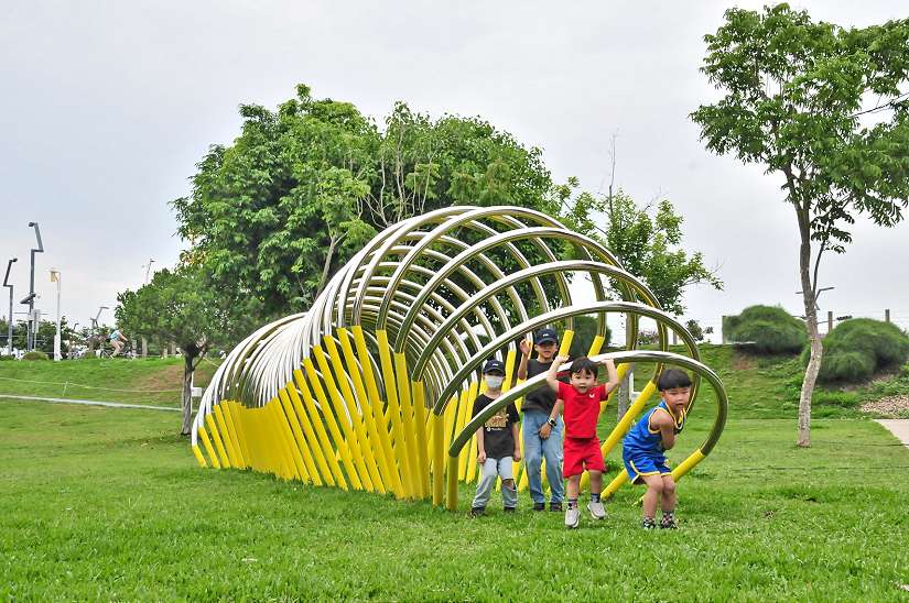 中央公園公共藝術再現新亮點!全新創作《綠野遊蹤》巨大毛毛蟲全長近10公尺,夜幕低垂後透過巧妙的燈光律動,讓大小朋友走入其中互動,彷彿在星空下緩步前進,帶來奇幻有趣的視覺體驗。