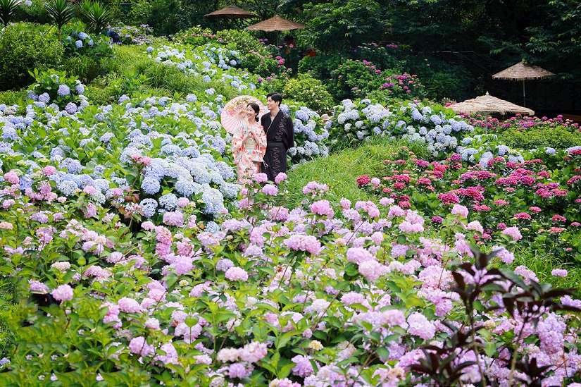 走進繡球花海 和服美照拍不停,5-6月的繡球花季,園主用心打造新的地景藝術,結合梯田式繡球花海,每個角落都是打卡景點。花田旁的農村茅草屋,充滿復古懷舊氛圍,走進一看令人驚豔,從屋頂到牆面妝點各式永生乾燥繡球花,猶如掉進夢幻場景。