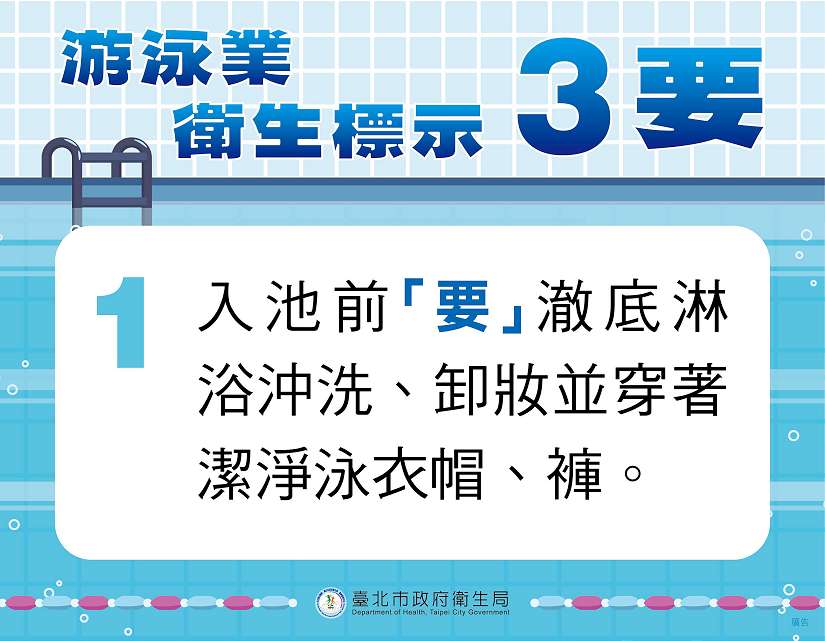 入池前「要」澈底淋浴沖洗、卸妝並穿著潔淨泳衣帽、褲。