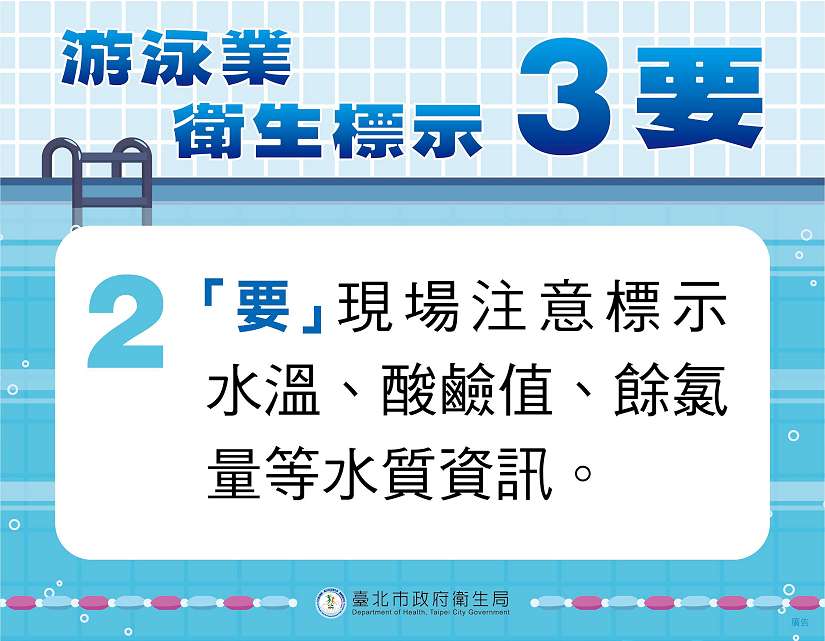 依據「臺北市營業衛生管理自治條例」規定,游泳業者應每個月自行汲取游泳池水,送檢水質微生物,另泳池開放期間應每月作水質酸鹼度與自由有效餘氯測定至少4次,夏季開放期間則每2小時測定1次,並將檢測結果公告於場所明顯處,讓消費者充分了解池水水質監測情形。北市衛生局公告游泳池水質應符合總菌落數每1公撮(mL)池水中應低於500 CFU;大腸桿菌群每100公撮(mL)池水中應低於(含)6 CFU或6 MPN;自由有效餘氯量應保持百萬分之1.0至3.0之間(1.0-3.0 ppm);水質之氫離子指數(pH值)應保持6.5至8之間。