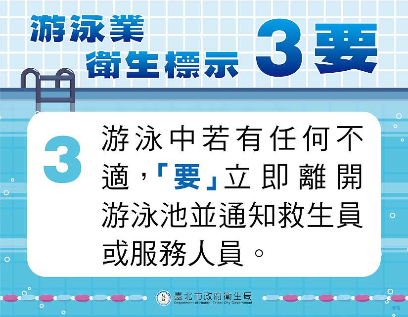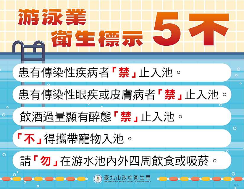 北市衛生局提醒民眾游泳時遵守「3要5不」: