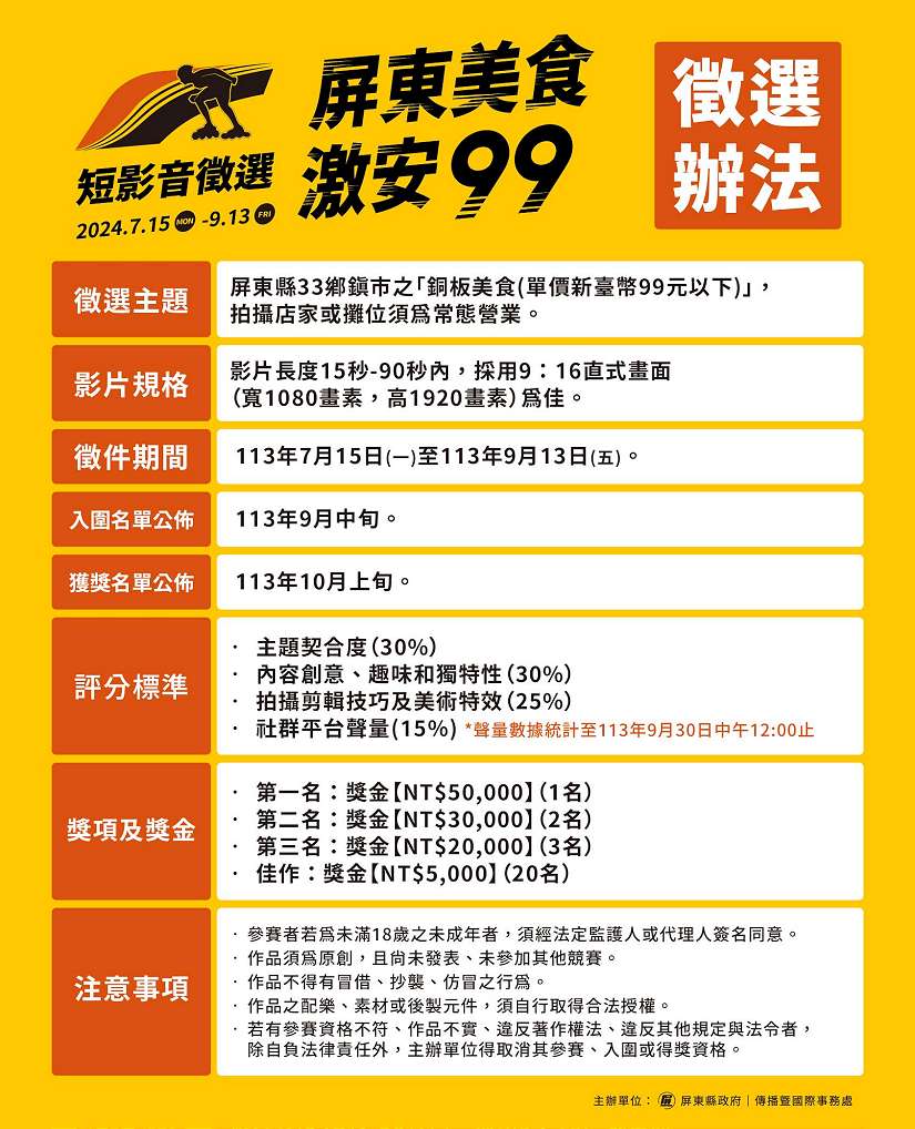 參賽短影音拍攝長度於15秒至90秒皆可投稿,投稿作需為未曾公開發表之原創作,影片規格採用9:16直式畫面(寬1080畫素,高1920畫素)為佳。經主辦單位確認影片規格及內容符合規定後,將提供參賽者「屏東美食激安99」形象LOGO置入於參賽影片,並將作品發佈至個人之社交平台即完成報名。