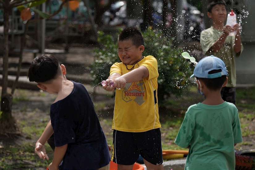 活動開始後,小朋友爭先恐後的伸手進入桶子裡面,拿起桶內的水球及碎冰開始找目標攻擊,有些人則是拿起自備的水槍噴水攻擊,不少家長也加入戰局丟水球及打冰仗,讓現場興奮的尖叫、歡笑聲此起彼落,炎炎夏日整個都清涼起來。