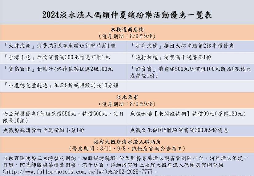 2024淡水漁人碼頭仲夏繽紛樂活動優惠一覽表-圖/新北市政府提供