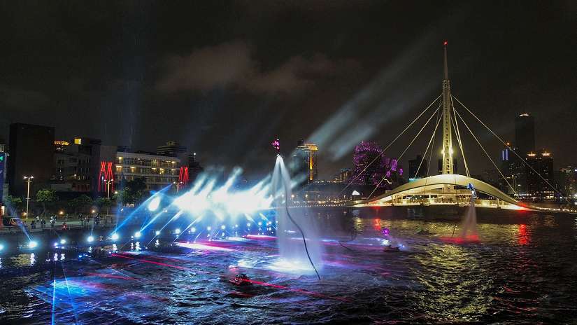 法國飛板秀是在全球演出的國際專業團隊,他們擁有多項專利裝置,這間法國娛樂公司曾在甫落幕的奧運開幕場地-塞納河做過精采演出,他們廣納來自世界的箇中好手,打造獨步全球的國際大秀,海委會及交通部航港局補助高雄市政府辦理的2024高雄海洋派對,特別邀請此一團隊在8月17日晚間6時30分於大港橋旁的水域進行開幕表演,前一日的總彩排就已炫翻眾人,讓周邊散步的市民不禁駐足,享受這巧遇的動人演出。