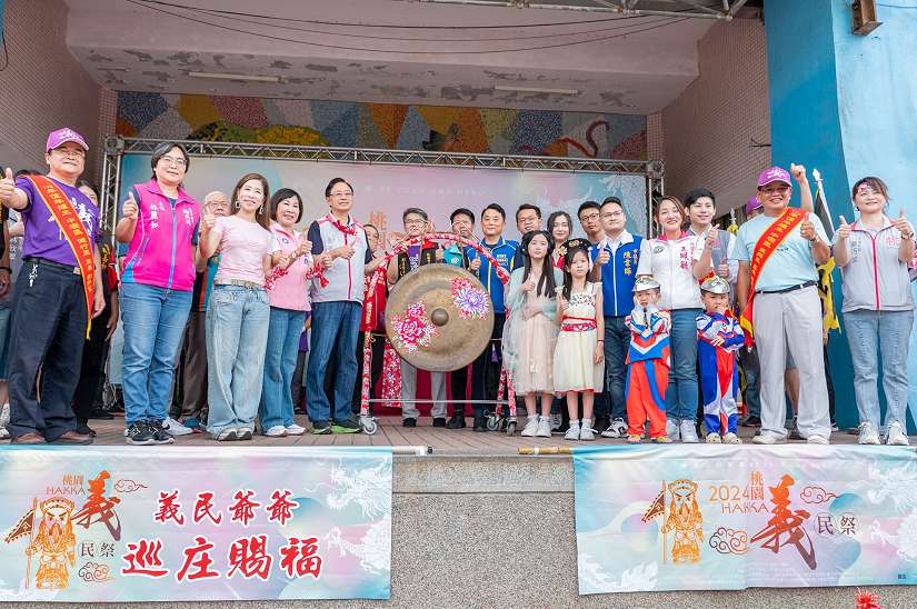 張市長表示,2024桃園客家義民祭首邀義民爺金身出巡,祈求義民爺護佑地方平安順遂,今遶境隊伍從林森國小出發,徒步遶行2.4公里至平鎮褒忠祠,由7個輪值里與市民親子團共同挑擔奉飯,結合創意踩街活動,重現過去地方百姓挑擔送飯給前線義民軍的場景,藉此紀念義勇軍的英勇事蹟,並傳承客家先民愛護鄉土的精神。