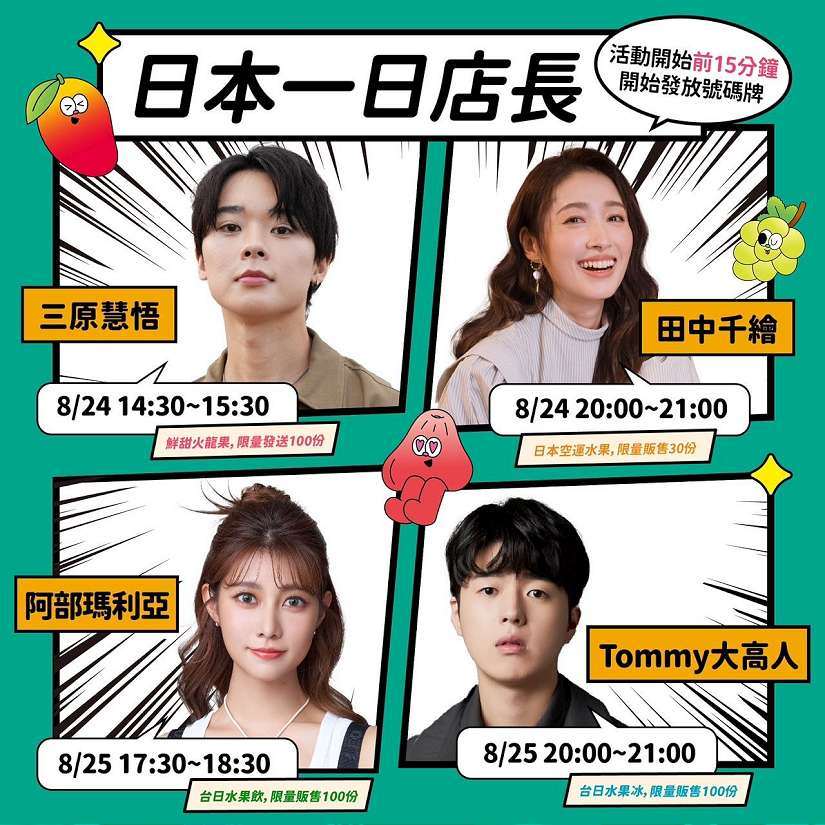 日籍女星田中千繪、阿部瑪利亞、Youtuber三原慧悟和Tommy大高人將接力擔任一日店長,台日吉祥物島根貓及蜜柑站長也準備好限量小禮。療癒系日籍主廚MASA(山下勝)特別設計芒果蝦仁莎莎醬及鮮果火腿天使義大利細麵的清爽夏日食譜,連兩日親自分享料理秘訣。台日大港水果祭8月24日、25日在高雄流行音樂中心海風廣場,歡迎國際朋友、全台民眾一起參加台日友好盛會。
