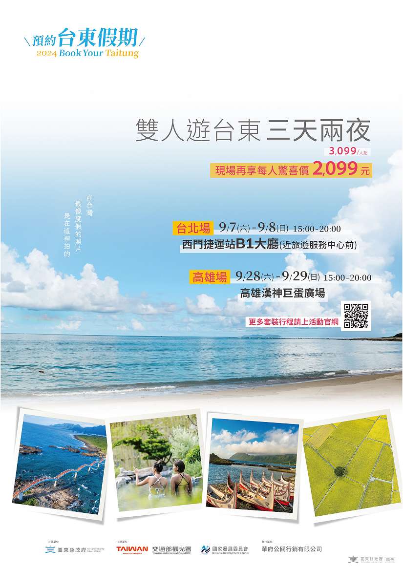 本次「2024預約臺東假期」展售會,雙人遊臺東三天兩夜,每人3,099元起,活動現場訂購行程,每人再省1,000元。如此破盤價優惠,讓許多西門站旅客紛紛停下腳步詢問。臺東套裝行程方案相當多元,網羅「天然溫泉」、「生態永續」、「部落旅遊」、「觀星導覽」及「農遊體驗」等知名景點,遊客可依安排時程或興趣,自由選擇自駕、組團方式出遊,盡情享受臺東慢活步調。