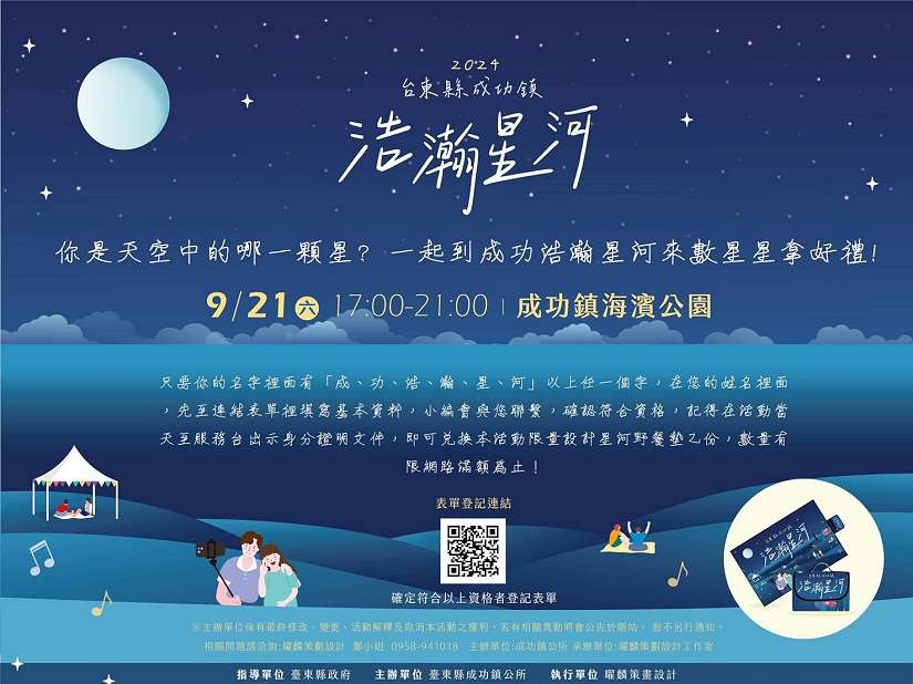 成功鎮鎮長謝淑貞表示,為了讓大家在浪漫的九月體驗不同的觀星活動,特別設計了多樣化的周邊活動,透過網路事先報名登記的「野餐墊活動」,將限量贈送專屬活動野餐墊。凡姓名中包含「成、功、浩、瀚、星、河」任一字者,成功完成報名後可於現場領取限量禮品,符合條件者每人限領乙份。此外,現場還將發送限量的「成功星星發光棒」,並開放網路及現場報名參加「月球彩繪燈」和「可愛卡通繪畫盤」等DIY手作體驗,讓民眾滿載「星」情而歸。