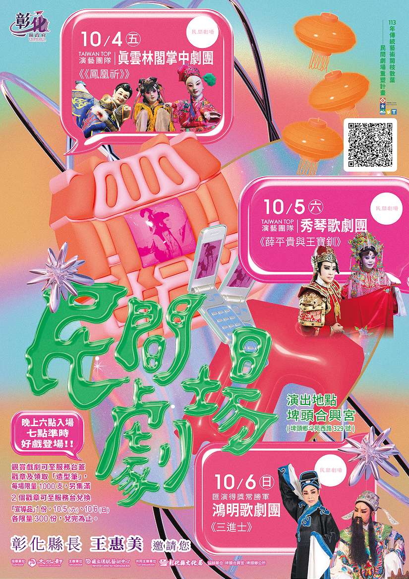 「國立傳統藝術中心「傳統藝術開枝散葉民間劇場重塑計畫」於今年5月份在彰化北斗演出,深獲好評,10月4日至6日又將回到彰化埤頭鄉,連續三天在擁有悠久歷史和濃厚文化氛圍的合興宮,帶來精彩的傳統戲曲演出,每天晚上6點開始入座,7點準時開演,不只好戲,還有好康拿不完,每天都有由彰化在地優質供應限量500顆的茶葉蛋,小朋友最愛發光動物造型筆限量1000支,還可以集戳章換好禮,集滿2個戳章就有機會兌得精美實用的禮品!內容活動十分精彩,歡迎民眾踴躍參加。