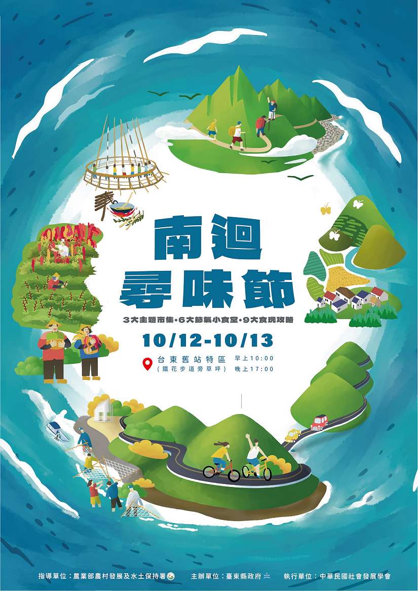 臺東縣政府為讓更多人認識並感受薈萃豐富的南迴風土,將於10月12、13日在臺東舊站特區鐵花步道旁草坪盛大舉辦「南迴尋味節」活動,集結南迴創意料理、質感手作、生活文化、農產好物於市集,一次網羅南迴從山林到海洋好滋味,讓大家體驗好山、好水、好玩、好好吃。