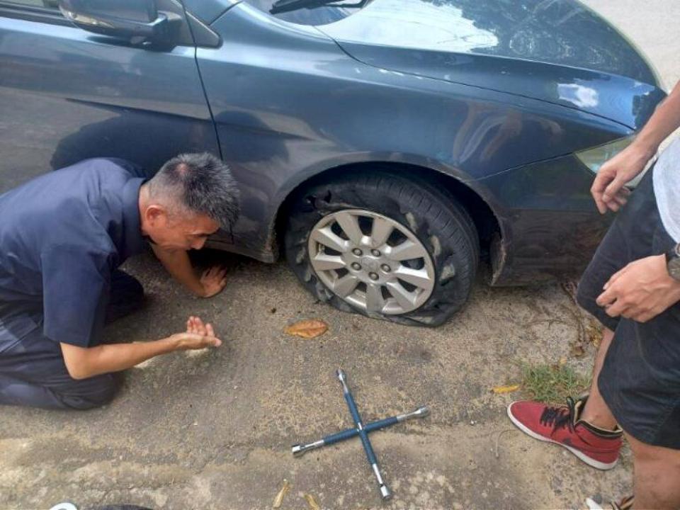 警方了解後先安撫廖男不安的情緒,並向其詢問是否有備用輪胎,廖男神色一亮隨即黯淡下來,因為自己..........