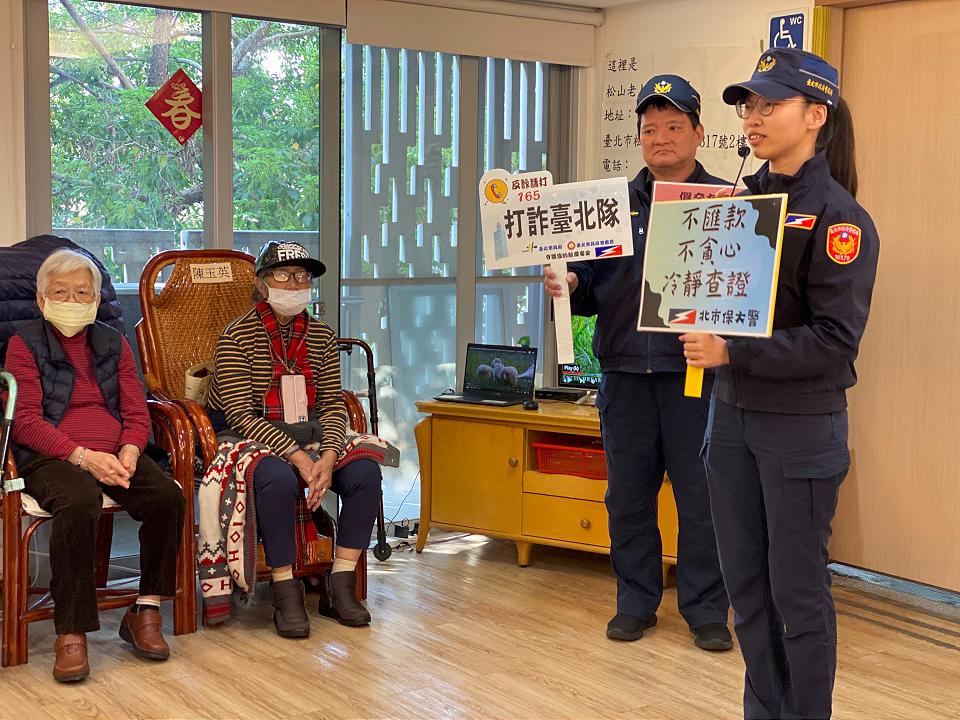 台北市保安警察大隊為避免高齡長者受騙,19日特地聯合「台北市政府社會局」在松山區鵬程里「健順養護中心」向社工師及獨居年長者們,進行「識詐、防詐」犯罪預防宣導,解說現今常見的「假投資」詐騙類型,保護年長者們財產安全!