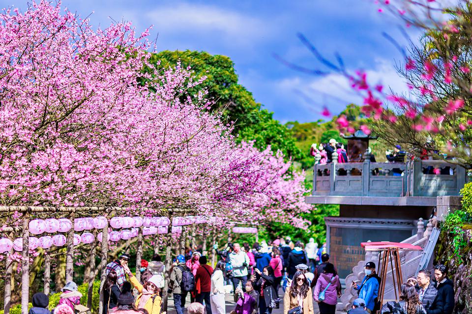 新北市淡水區的無極天元宮為北台灣知名賞櫻景點之一,每逢初春時節,園區後山的三色櫻即會率先綻放,粉色、米色與桃紅三色層次豐富;另外在天壇周圍種植的櫻花則為吉野櫻,花期較三色櫻約慢一個月,花朵較大且粉白,各有各的風情與韻味。