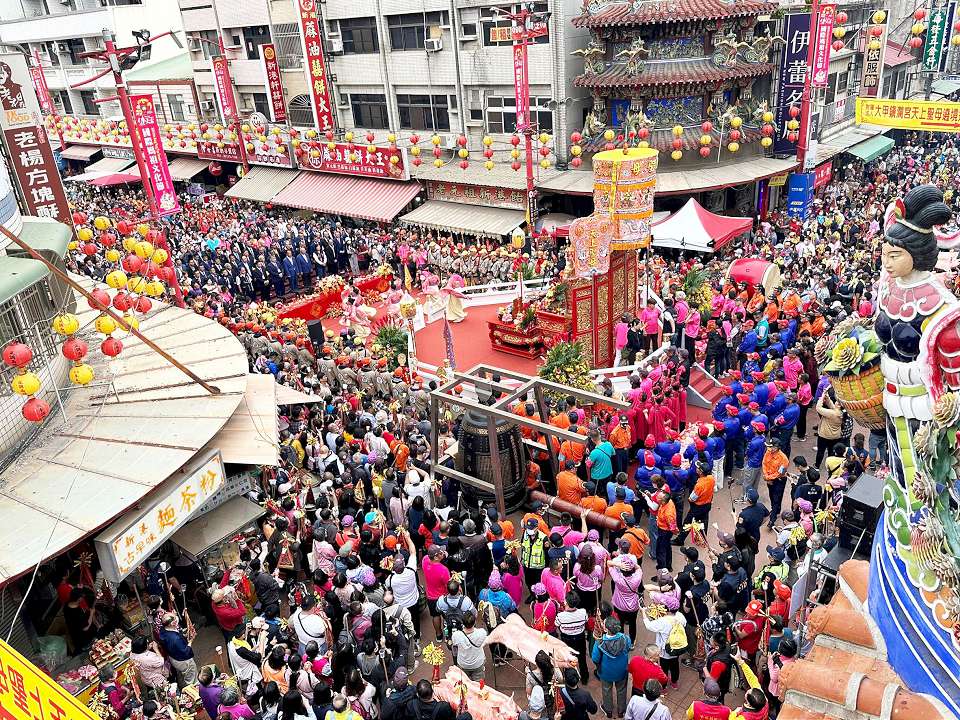 大甲鎮瀾宮媽祖4月5日23時起駕,沿途行經台中市、彰化縣、雲林縣及嘉義縣,所到之處信徒都虔誠跟隨,9天8夜遶境進香在信眾恭迎下,9日凌晨駐駕嘉義新港奉天宮,上午8點舉辦媽祖祝壽大典,儀式全程兩小時,由主祭們率領在場數萬信徒,一起遵循古禮為媽祖上香、獻花、獻果、誦經及行三跪九叩禮,祝賀媽祖萬壽無疆,典禮尾聲由廟方準備豬公祭拜,提供豬肉讓信眾領取。