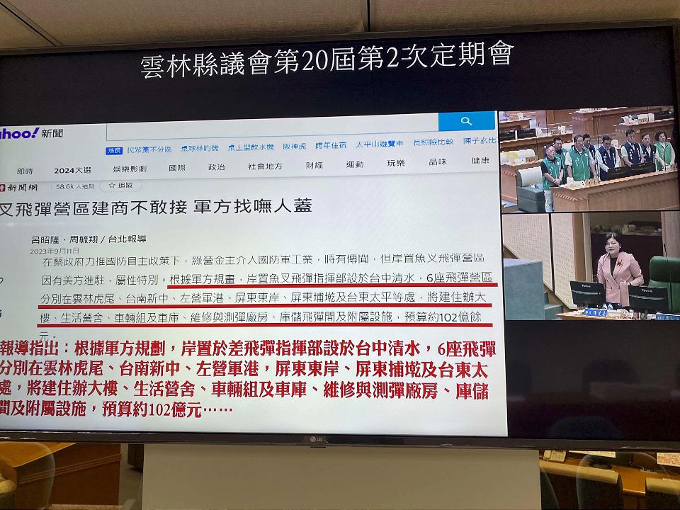 有關媒體報導國防部岸置魚叉飛彈指揮中心,將設置於雲林虎尾等六處一事,7日雲林縣議會第二十屆第二次定期會總質詢,國民黨、民意黨團及誠信黨團聯合質詢,縣長張麗善表示,雲林人口多基礎建設多,嚴正抗議與堅決反對立場。