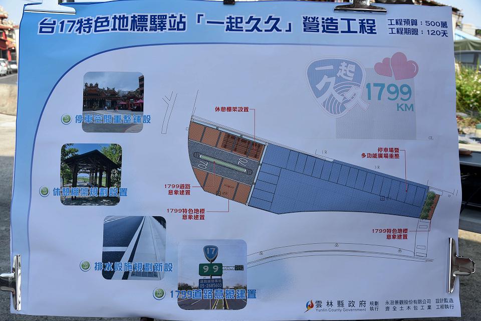縣長張麗善表示,工程建設位置位於台17線99K處,也就是在代天府前方不遠處,1799諧音「一起久久」,是情侶們的真愛密碼,我們特規劃打造成為雲西環台公路重要地標,要讓情侶們到此打卡拍照,愛情久久。這裡將有休憩涼亭、停車空間規劃、景觀環境改善等,工程完成後可以提供興安代天府每逢慶典及新年期間湧入大量人潮及攤商的服務,提供香客、遊客最佳的觀光品質。此外,還可以搭配興安代天府周邊主要聚落區的餐飲及便利超商服務,提供具在地特色的優質服務空間,營造成為單車、機車及遊客環台優質休憩停留站。