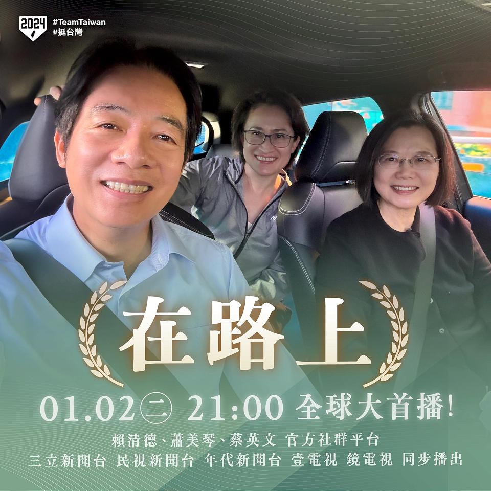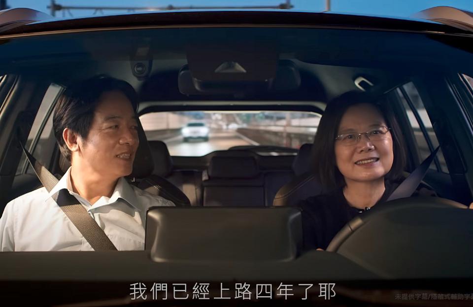 民進黨正副總統後選人賴清德、蕭美琴全國競選總部,2日21時許推出新競選廣告「在路上-交棒篇」,短短16小時突破61萬次點閱,這支廣告中總統蔡英文開車,副總統賴清德在副駕駛座上,2人在影片中輕鬆對談間,卻將這些年他們一起並肩作戰,讓國家走在對的路上表露無遺,另外在途中蔡英文下車將汽車鑰匙交棒給賴清德,由他駕駛載著蕭美琴繼續前進,讓他們繼續帶領台灣,朝著民主繁榮、自信尊嚴的方向,持續穩健前行。
